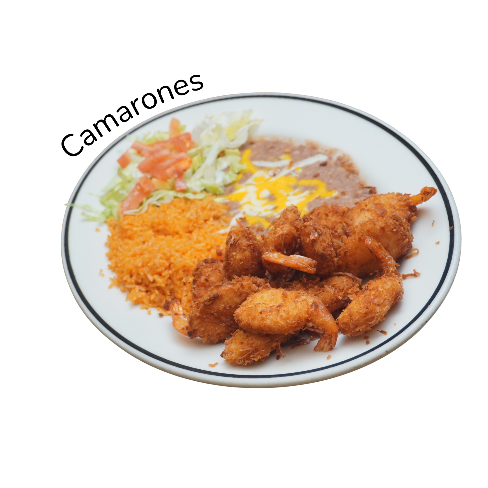 Battered prawns dipped in coconut flakes. Served with coconut dip, rice, beans, and tortillas.